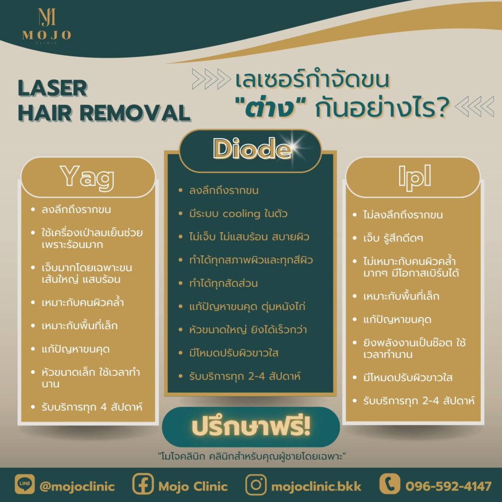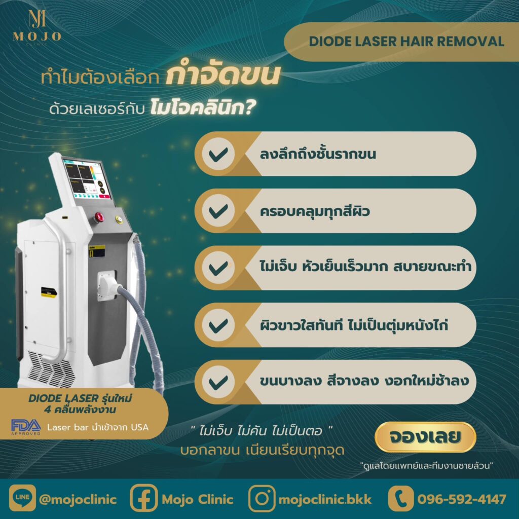 Diode Laser (ไดโอดเลเซอร์) ที่โมโจคลินิกใช้กำจัดขน เป็นนวัตกรรมรุ่นใหม่แบบ 4 ความยาวคลื่น ด้วยการยิงคลื่นแสงคุณภาพสูงจำกัดลงลึกถึงรากขน หัวยิงทำความเย็นเร็ว ช่วยให้ไม่รู้สึกแสบร้อนและไม่รู้สึกเจ็บ ใช้ได้กับ ทุกภาพผิวและทุกบริเวณแม้จุดซ่อนเร้น