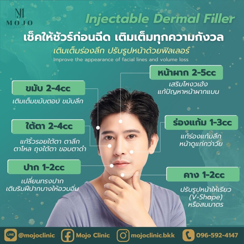 มีหลายยี่ห้อ เช่น Restylane (สวีเดน), Neuramis (เกาหลี), e.p.t.q. (เกาหลี), Juvederm (อเมริกา), Belotero (สวิตเซอร์แลนด์), YVOIRE (เกาหลี)แต่ละยี่ห้อก็จะมีรุ่นย่อยๆ ที่มีคุณสมบัติ ความคงตัว จุดที่เหมาะกับการใช้ และระยะเวลาต่างกันฟิลเลอร์จะสามารถอยู่ได้ประมาณ 1 ปี และไม่เกิน 2 ปี ขึ้นอยู่กับยี่ห้อและชนิดของฟิลเลอร์ บริเวณที่ฉีด รวมถึงการดูแลตนเอง และฟิลเลอร์จะสามารถสลายตัวได้เองจนไม่เหลือตกค้าง 100% โมโจ คลินิก เลือกใช้ฟิลเลอร์ของแท้ และผ่านการรับรองมาตรฐานเท่านั้น และให้บริการโดยแพทย์ที่มีประสบการณ์