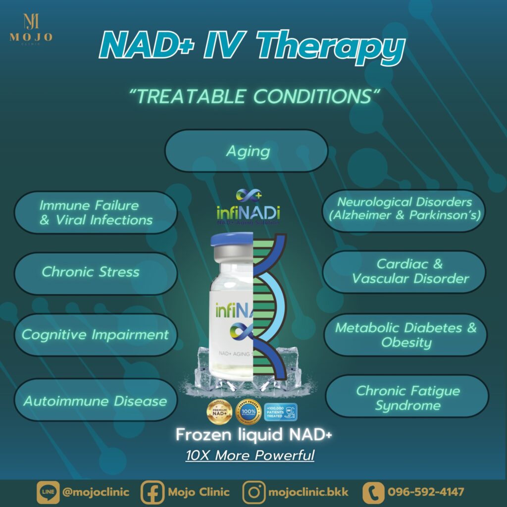 NAD+ ถือว่าเป็น”ขั้นกว่า”ของการให้วิตามินผ่านทางหลอดเลือด NAD+ ย่อมาจาก Nicotinaminde adenine dinucleotide คือหนึ่งในโคเอนไซม์ที่สำคัญที่สุดในร่างกาย เป็นนวัตกรรมการชะลอวัยด้วยประสิทธิภาพที่มากกว่า และได้รับการทดสอบและรับรองจากมหาวิทยาลัยเฮลซิงกิ ประเทศฟินแลนด์ และรับรองจากงานวิจัยหลายฉบับว่านอกจากการชะลอวัยแล้ว NAD+ ยังช่วยชะลอโรคที่เกิดจากความชรา รวมถึงชะลอการเสื่อมสภาวะของระบบประสาท โรคหัวใจ หลอดเลือด โรคเบาหวาน โรคอ้วน และอาการอื่นๆ ที่เกี่ยวข้องกับการเสื่อมวัยได้ด้วย