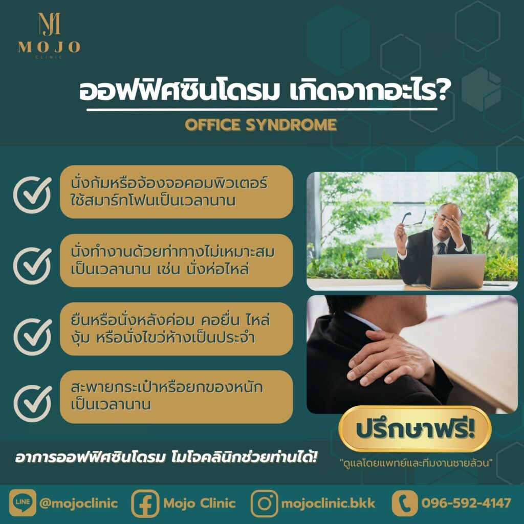 โรคยอดฮิตชีวิตคนทำงาน เป็นกลุ่มอาการที่เกิดขึ้นในกลุ่มคนทำงานออฟฟิศ ซึ่งอาจเกิดจากการนั่งทำงานจดจ่ออยู่กับคอมพิวเตอร์หรือใช้สมาร์ทโฟน ด้วยท่าทางซ้ำๆ และต่อเนื่องเป็นเวลานาน หรือใช้ท่านั่งและจัดวางอุปกรณ์การทำงานไม่เหมาะสม เช่น การนั่งห่อไหล่ นั่งไขว่ห้างเป็นประจำ ก้มคอมากเกินไป สะพายกระเป๋าหรือยกของหนักเป็นเวลานาน จึงทำให้เกิดความผิดปกติในร่างกาย เกิดเป็นอาการปวดเมื่อยหรือชาตามบริเวณต่างๆ รวมทั้งอาจเกิดจากการพักผ่อนไม่เพียงพอ การรับประทานอาหารไม่ตรงเวลา ได้รับสารอาหารไม่ครบ 5 หมู่ ซึ่งควรได้รับการดูแลรักษาที่ถูกต้องเพื่อช่วยลดโรคทางระบบกระดูกและกล้ามเนื้อที่อาจตามมาได้