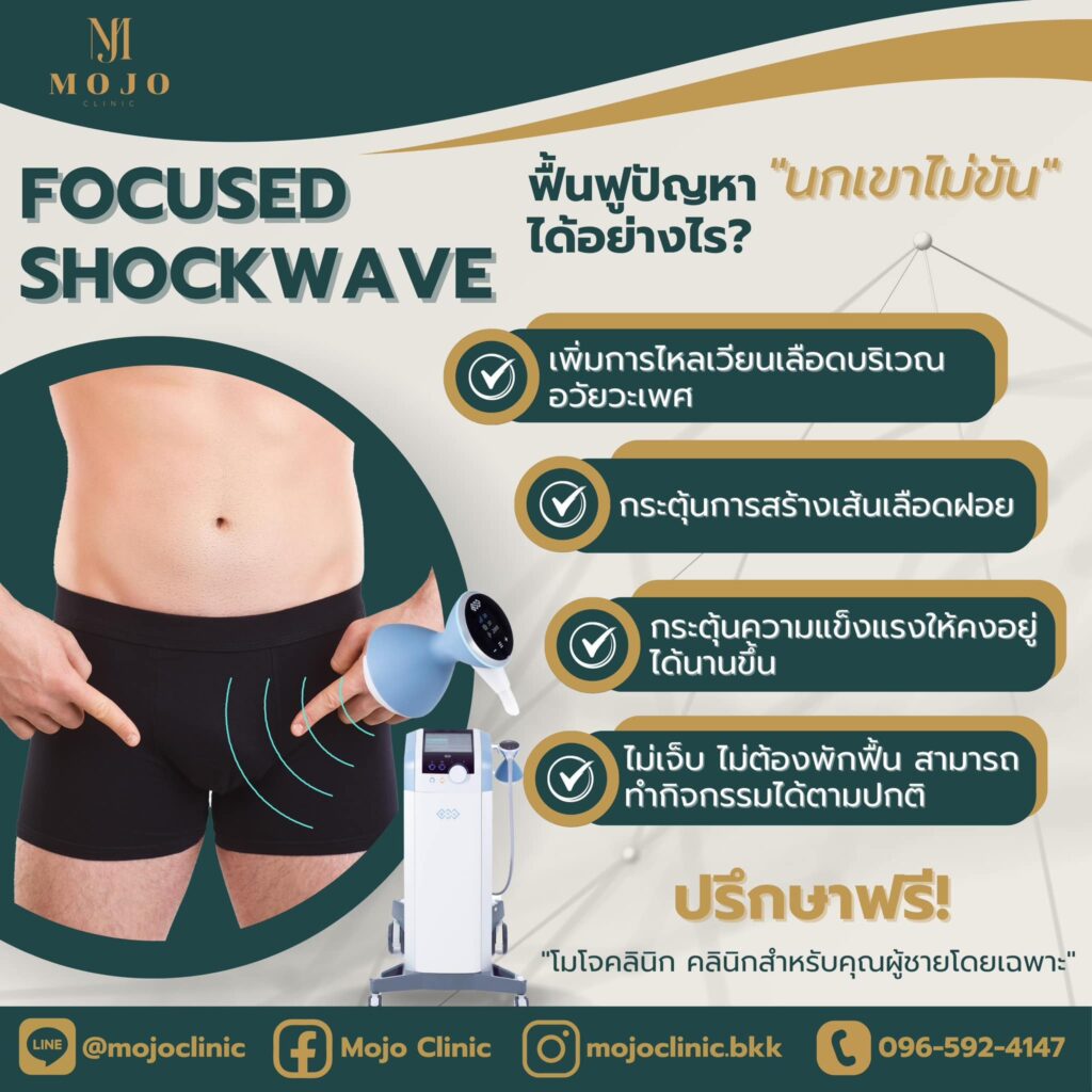 ปัจจุบันมีเทคโนโลยีที่ใช้ในการใช้รักษาภาวะหย่อนสมรรถภาพทางเพศด้วยการใช้คลื่นเสียงความถี่ต่ำกระตุ้น การไหลเวียนของเลือด ซึ่งโมโจคลินิกใช้เครื่อง focused shockwave เป็นเครื่องนำเข้าจากประเทศอังกฤษ และเป็นเทคโนโลยีที่ทันสมัยที่สุดในปัจจุบัน โดยเป็นเครื่องที่ได้มาตรฐานและมีงานวิจัยรับรอง กลไกการทำงานของเครื่อง คือ สามารถส่งพลังงานได้ลึก สามารถปรับระดับความลึก ความถี่ของพลังงานที่ใช้ เพื่อให้เหมาะสมกับแต่ละบุคคล ช่วยให้ทำการรักษาได้อย่างตรงจุด เหมาะสำหรับผู้ที่มีปัญหาเลือดไปเลี้ยงอวัยวะเพศไม่เพียงพอ จะช่วยกระตุ้นการไหลเวียนของเลือดและสร้างเส้นเลือดฝอยใหม่ในอวัยวะเพศชาย เลือดก็จะเข้าไปเลี้ยงอวัยะเพศได้ดีขึ้น ช่วยให้สามารถแข็งตัวได้ดีขึ้น